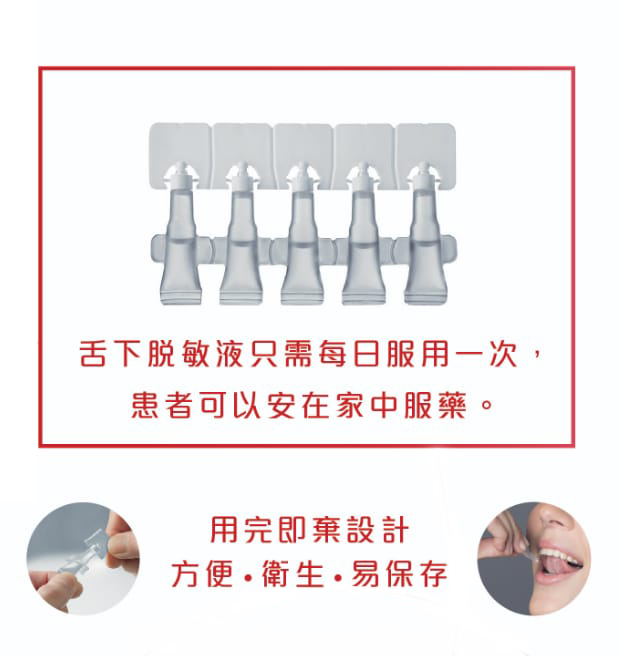 口服脫敏治療,含在舌下 / 脷底,以助患者脫敏。舌下脫敏液只需每日服用一次,患者可以安在家中服藥,無需定時到診所覆診。